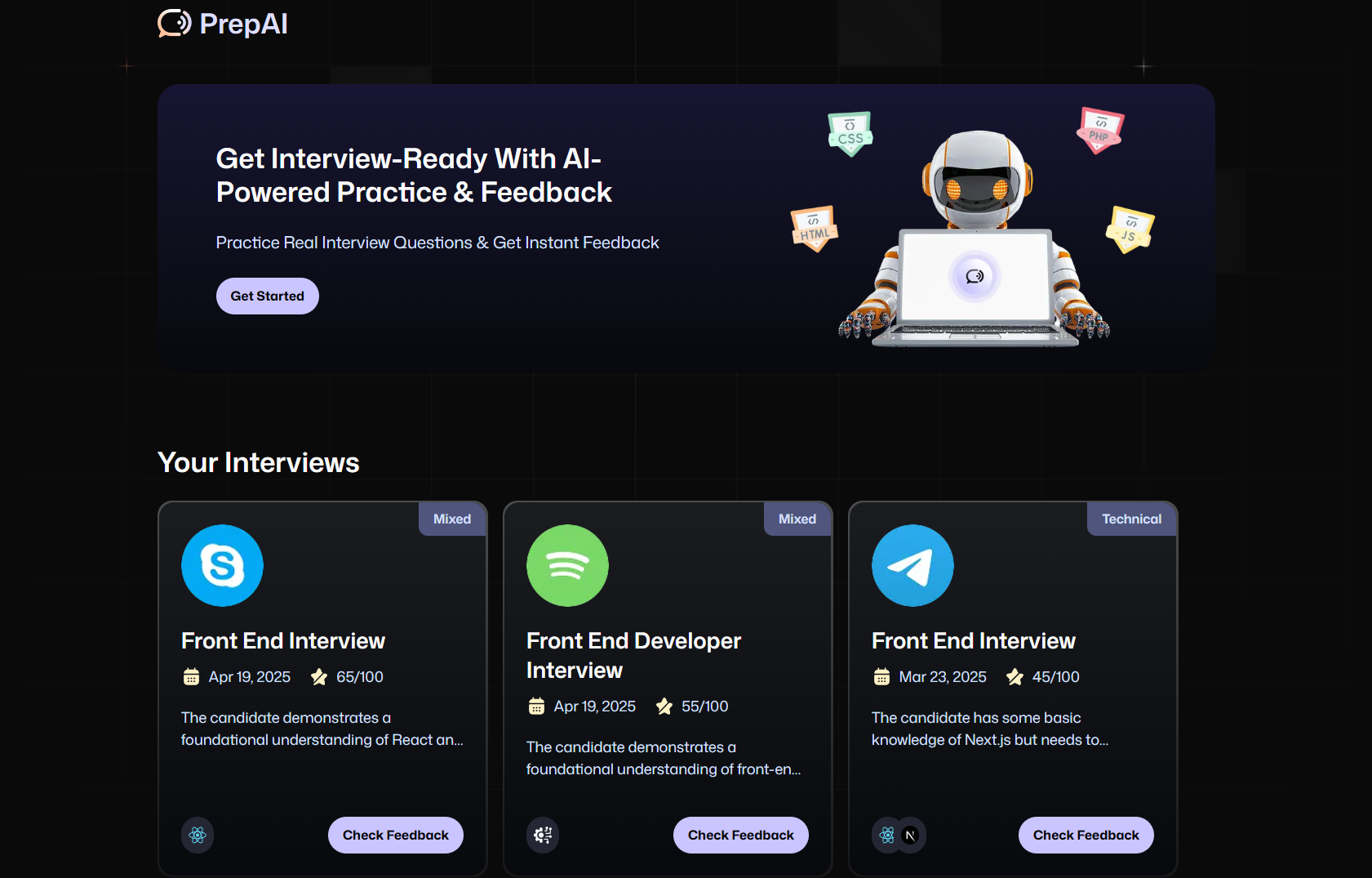 PrepAI is an AI-powered mock interview platform built with NEXT.js, Firebase,